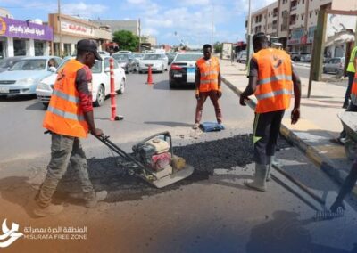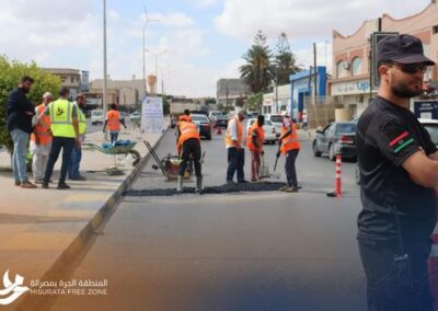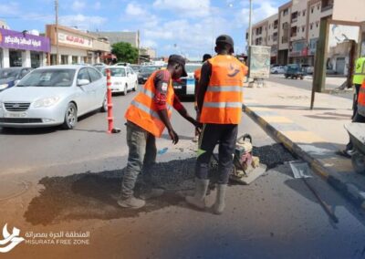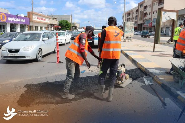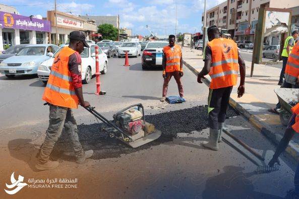 بمساهمة من المنطقة الحرة بمصراتة باشرت فرق صيانة الطرق التابعة لديوان بلدية مصراتة أعمالها في شوارع المدينة، وبدأت بمعالجة الحفر والتشققات داخل نطاق الطريق الدائري الثالث بالتعاون مع مديرية أمن مصراتة.