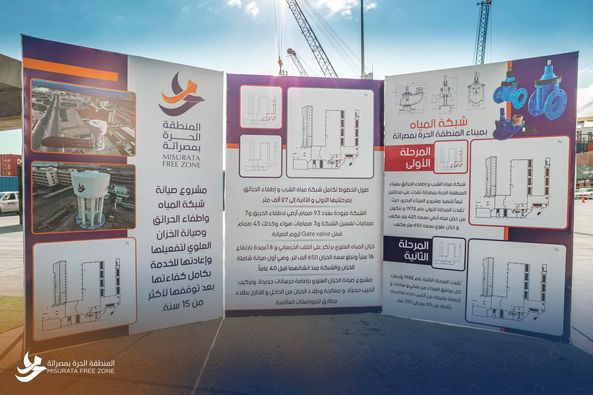 و تزامنت أعمال صيانة شبكة المياه و اطفاء الحرائق مع الانتهاء من أعمال صيانة خزان المياه العلوي يرتكز على القلب الخرساني و 8 أعمدة بارتفاع 16 متراً وتبلغ سعة الخزان 650 ألف لتر، وهي أول صيانة شاملة للخزان و الشبكة منذ انشائهما قبل 40 عاماً، و باستكمال أعمال الصيانة للشبكة و خزان المياه سيتم تزويد كل مرافق الميناء اضافة الى تزويد السفن و تفعيل نقاط اطفاء الحرائق ما يرفع من مستوى السلامة به، و الجدير بالذكر أن أعمال صيانة شبكة المياه نُفّذت بواسطة فريق عمل من الكوادر الفنية بالمنطقة الحرة بمصراتة ما أسهم في انجاز الاعمال بجودة عالية و في وقت وجيز بعد التشخيص الفعلي الدقيق للشبكة و تحديد المسارات المتهالكة و استبدالها و صيانة كافة الصمامات و استبدال المتعطل منها.