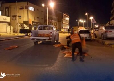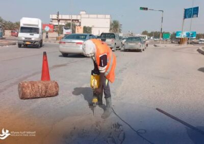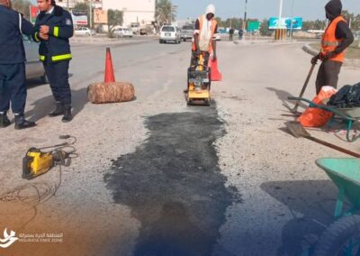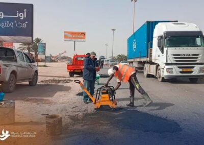 و تشمل أعمال الصيانة الطرق الدائرية الرئيسية بالبلدية إضافة إلى طريق البحر المؤدي للميناء وتعتبر هذه الأعمال ضمن المسؤوليات المجتمعية، وهي أحد المبادئ الرئيسية للمنطقة الحرة بمصراتة.