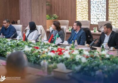 تم خلال الزيارة عرض فيديو تعريفي عن المنطقة الحرة بمصراتة ، والتعريف بأوجه الإستثمار والبنية التحتية والمشاريع القائمة والمستقبلية ، وفتح باب النقاش والإستفسار للوفد حول المزايا والإعفاءات والفرص الإستثمارية .